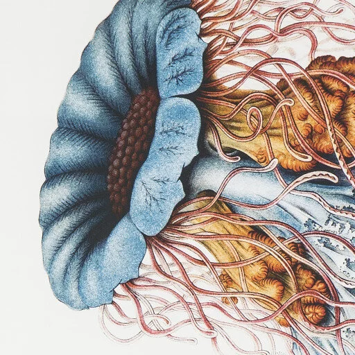 DESCRIPTION: Printed image of a jelly fish. Giclee print on archival paper in triptych frames.